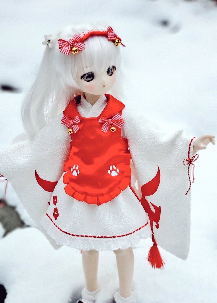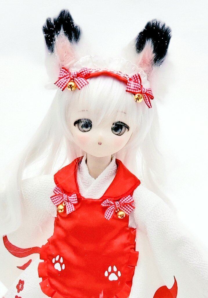 袖にオリジナルイラストの狛狐がプリントされたワンピース、足跡プリントの赤いエプロン、ヘアアクセのセット。