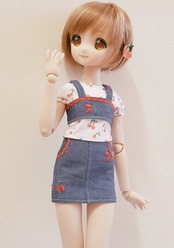 さくらんぼ刺繍のデニムを使用したタイトスカート、ビスチェ、さくらんぼ柄パフスリーブカットソーの3点セットです。