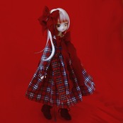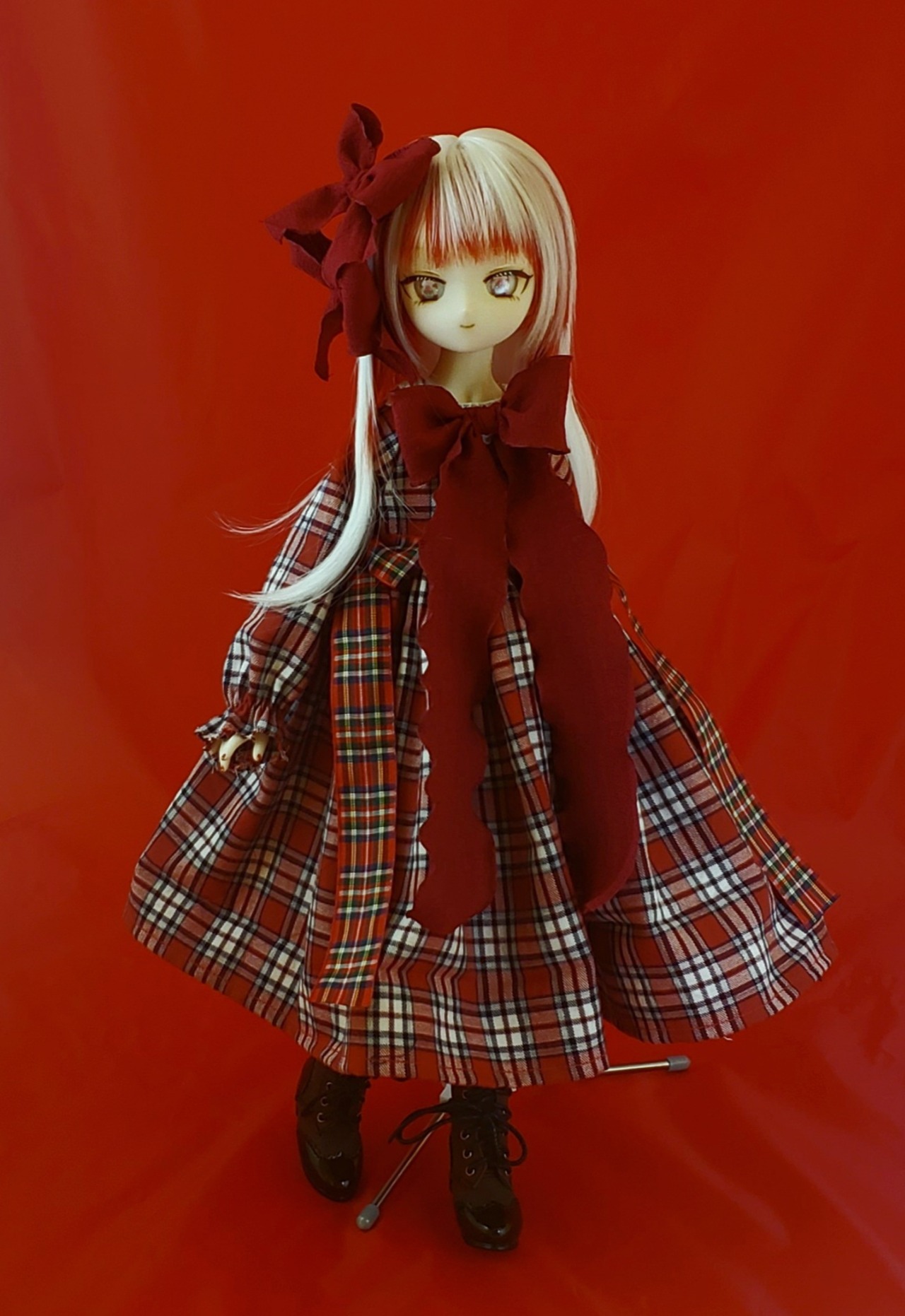 ロング丈のチェックのワンピースとヘアリボンのセット。