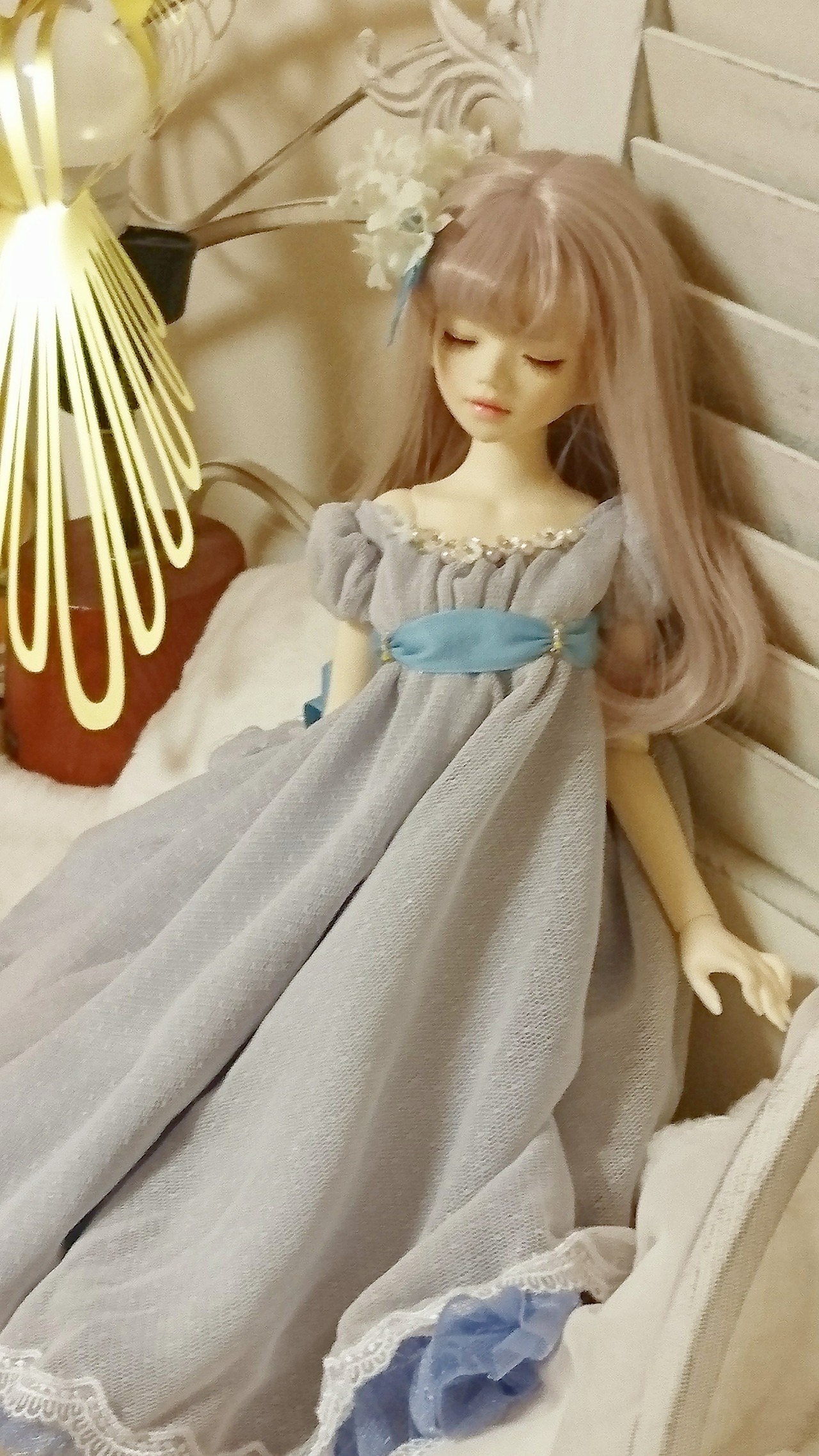 ベースの淡いブルーの生地に、ラメのブルーのチュール生地とミルク色のドットチュールを重ねたワンピース